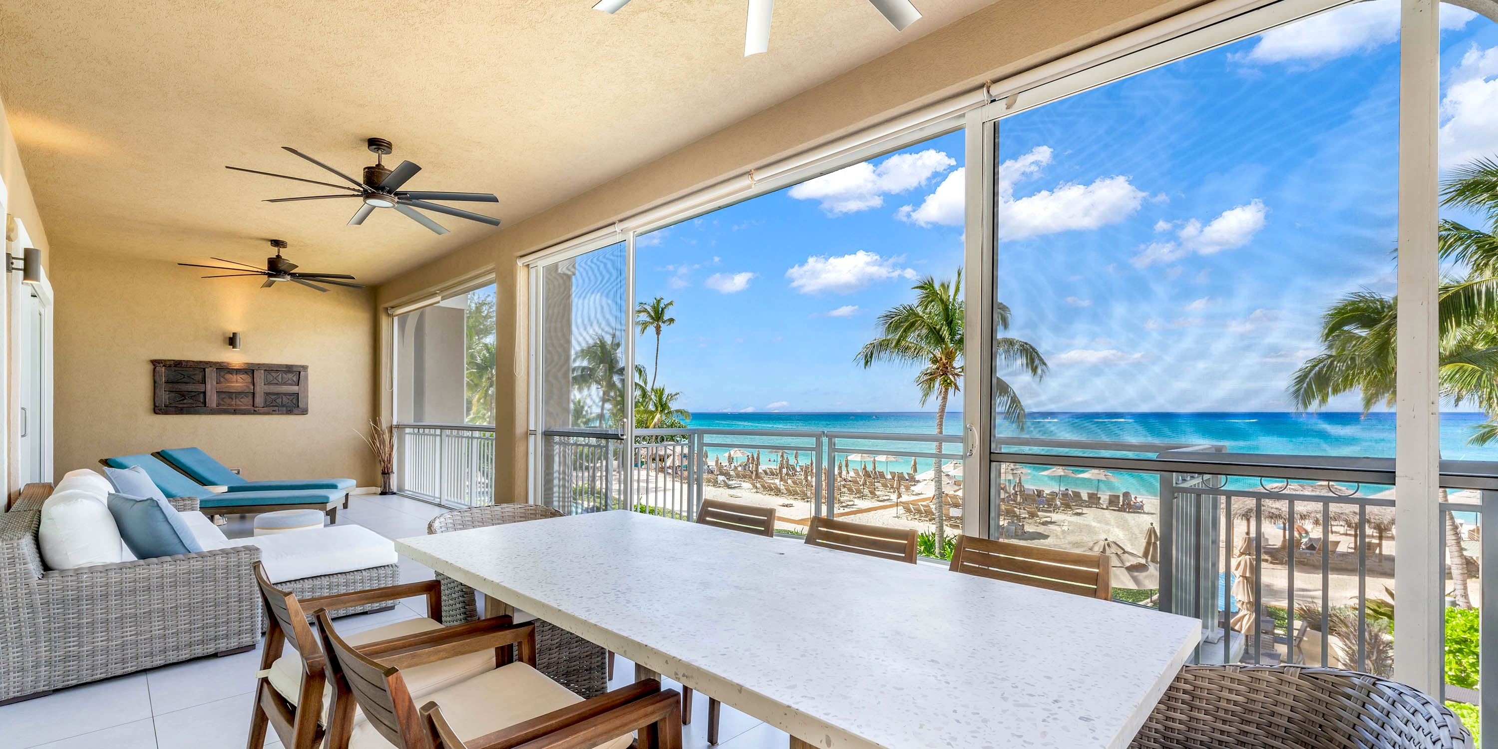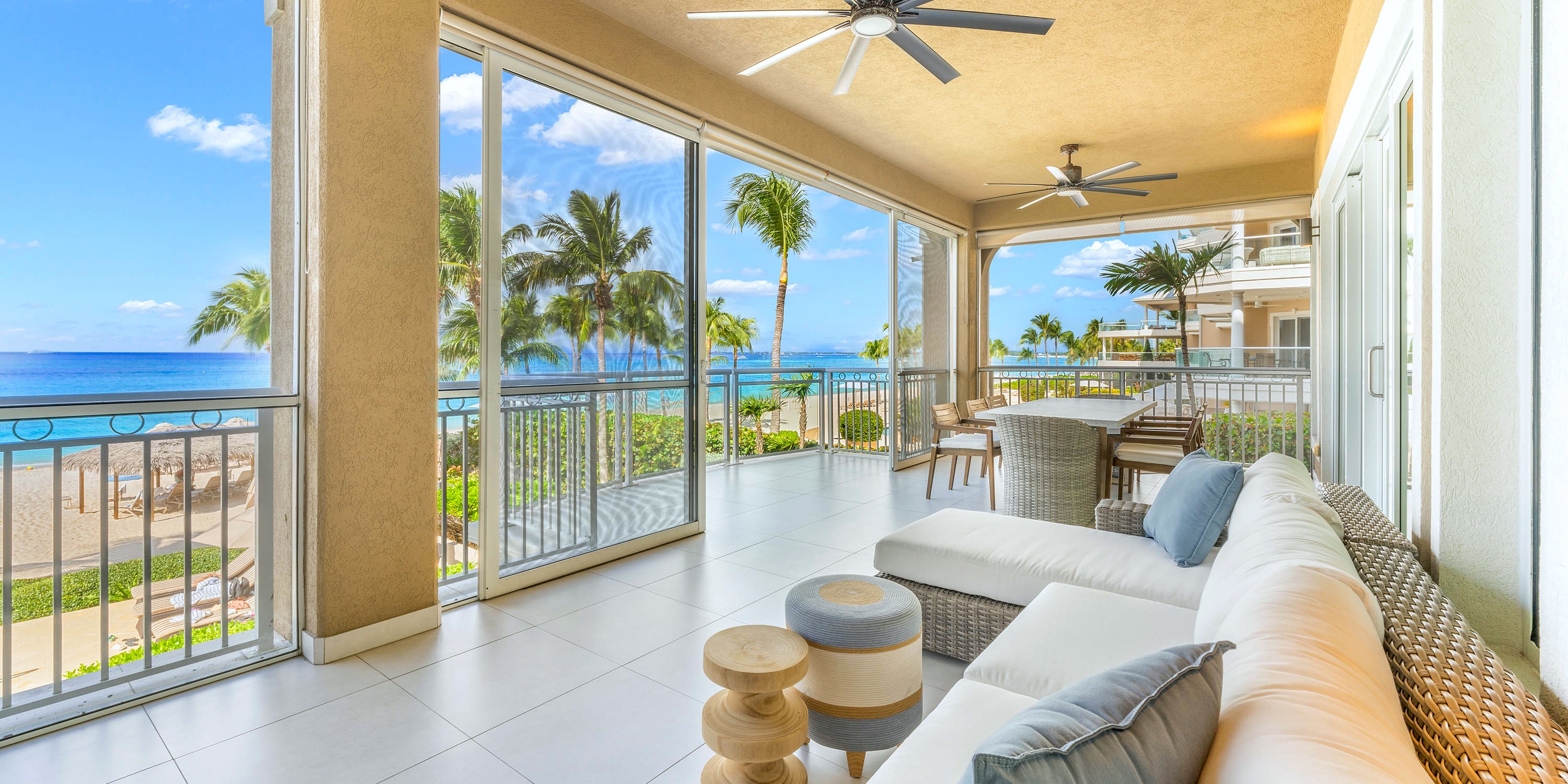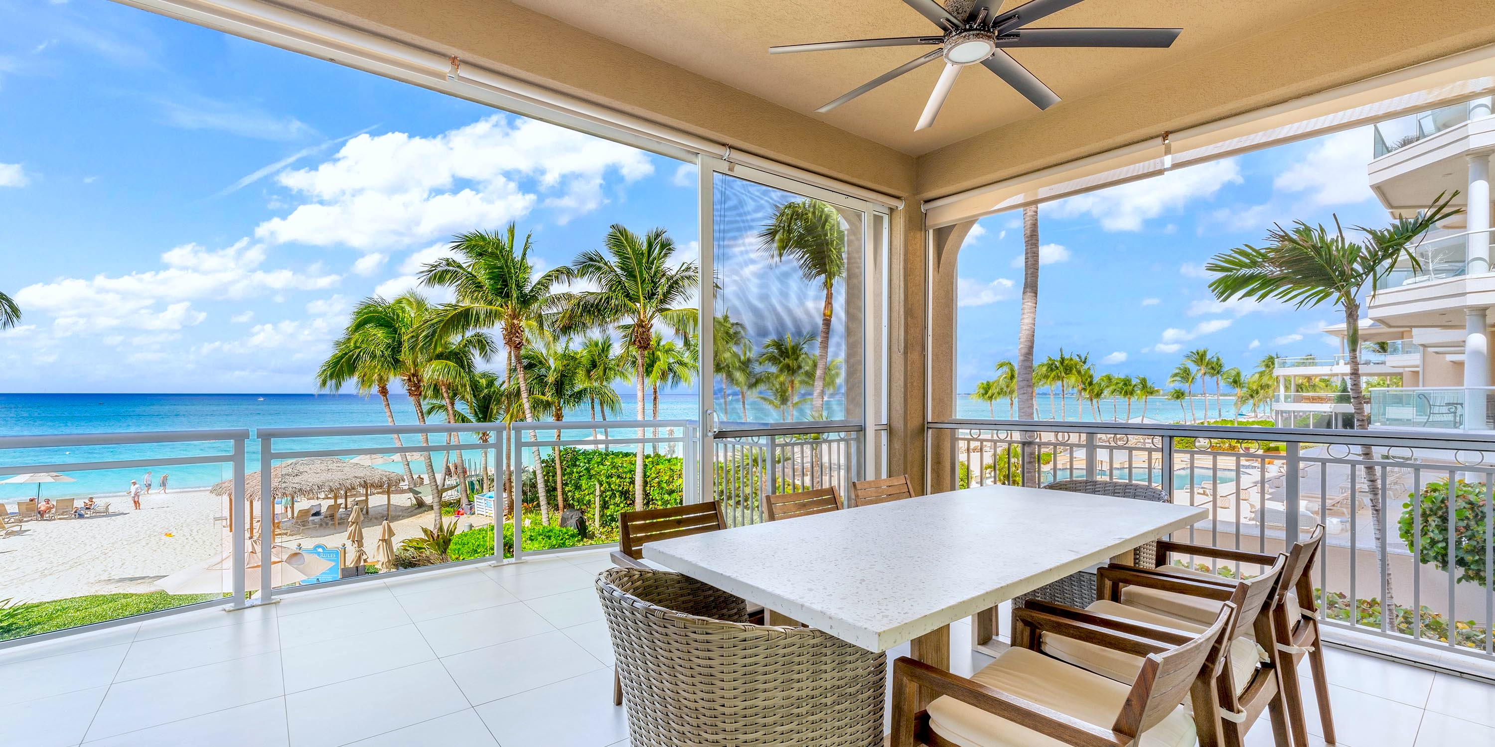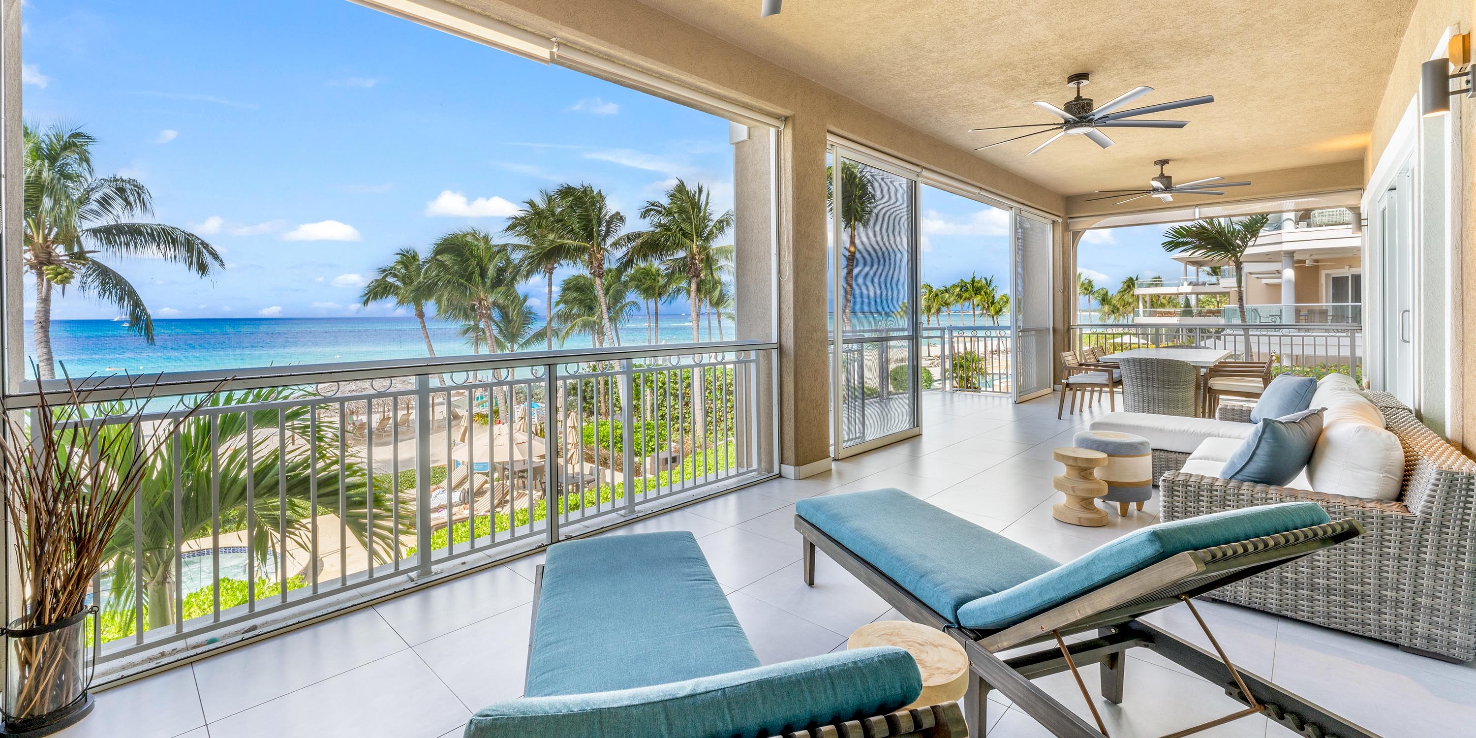 Each unit comes furnished with either a spacious oceanfront patio or a balcony. Ground floor units enjoy walk-out access from the patio to the pool deck and beach--very convenient! The upper floors, however, enjoy elevated balcony views of beautiful Seven Mile Beach.
