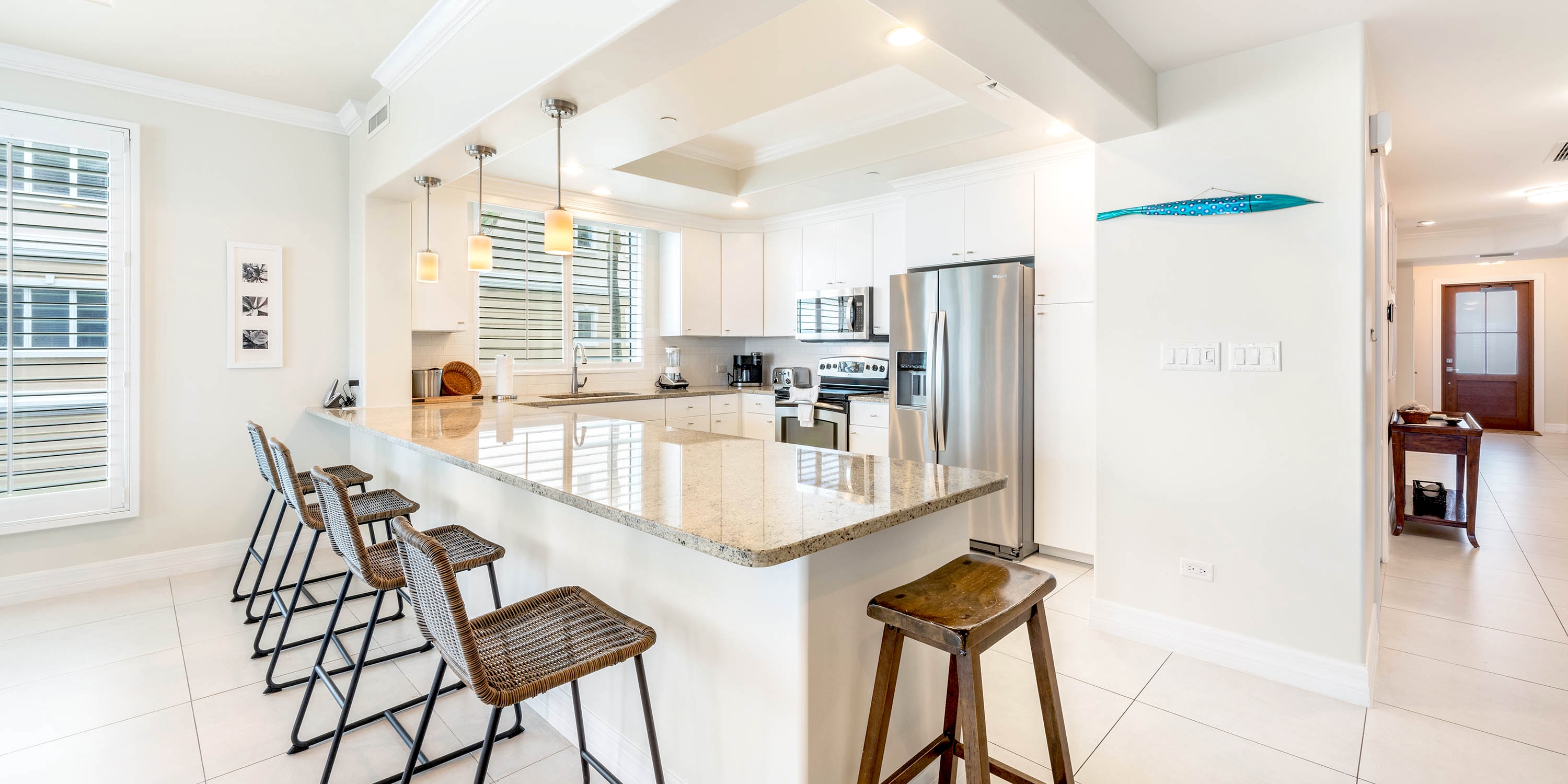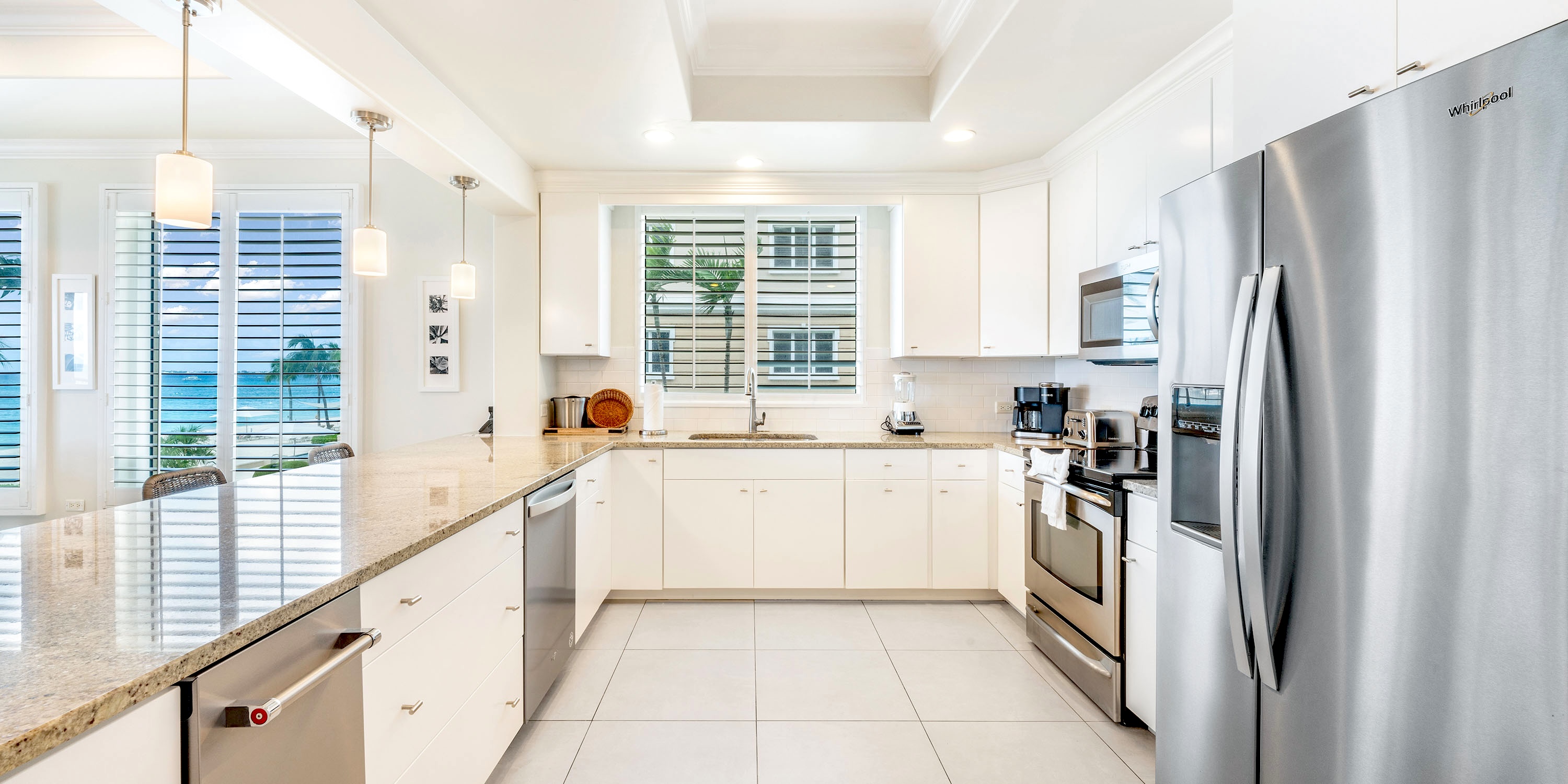This second-floor unit features expansive living areas, 4 bedroom suites, and a gourmet kitchen with stainless steel appliances. Cookware, glassware, dinnerware, and cutlery are all provided.