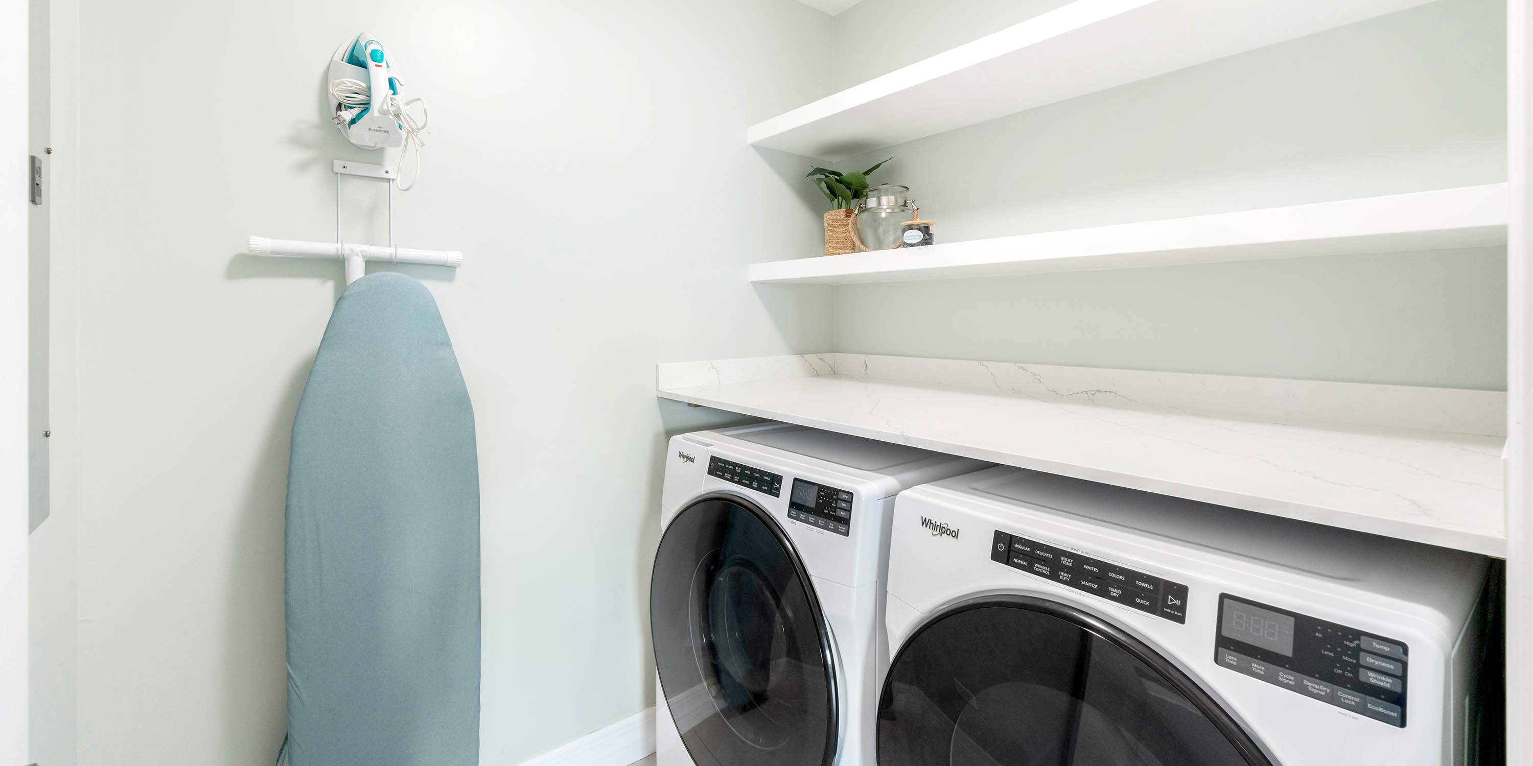Every condo also includes a separate laundry room with a washer, dryer, laundry sink, plus iron and board.